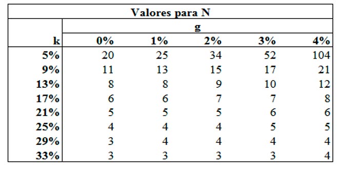 Asumiendo distintos valores de g y k, se obtiene el siguiente cuadro para N:
